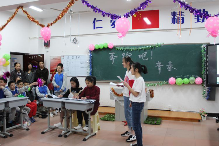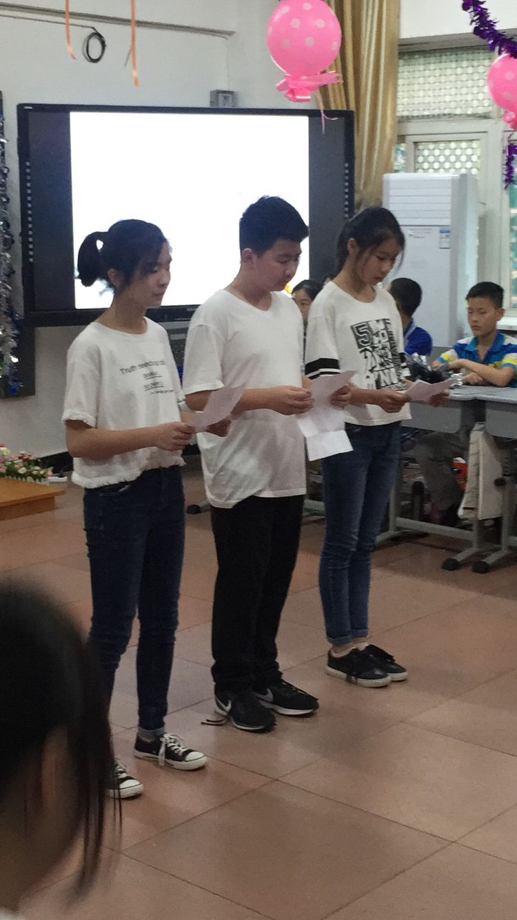在优美的音乐中,伴随着主持人饱含深情地朗诵,主题班会正式开始。